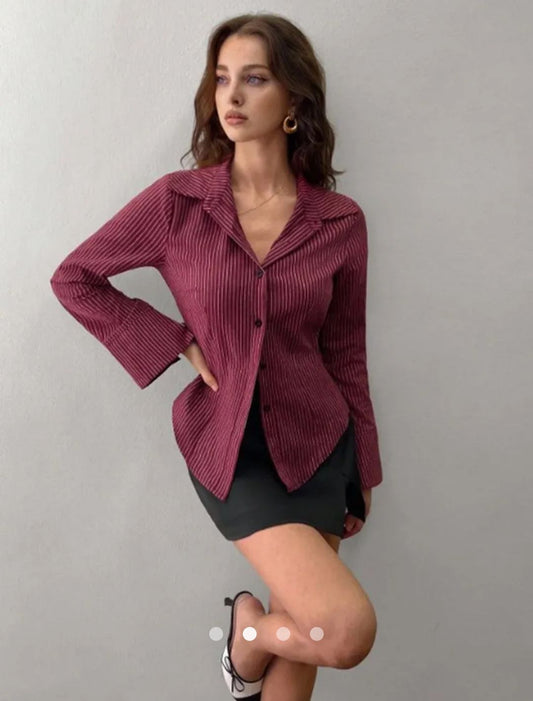 Chic Fitted Silhouette Striped Shirt // Burgundy