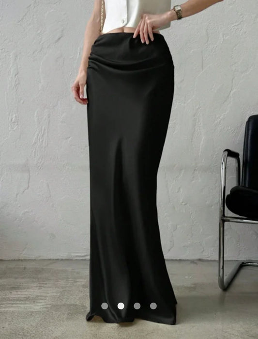 Regular price Rs. 1,299.00Regular priceUnit price perRs. 1,499.00Sale price Rs. 1,299.00Ruched Detail Satin Maxi Skirt // Black