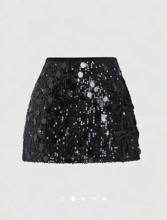 Regular price Rs. 1,199.00Regular priceUnit price perRs. 1,499.00Sale price Rs. 1,199.00Sequin Mini Skirt With Side Bow Tie // Black